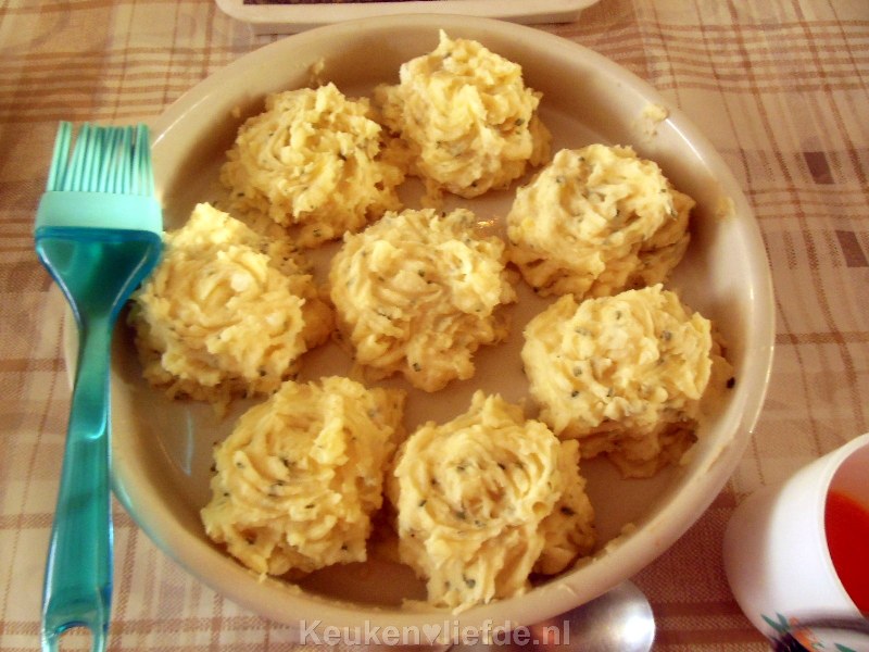 Had helaas geen spuitzak meer maar met een beetje fantasie lukte het wel om het nog even onder de gril te zetten. Met een beetje paneermeel en kaas.