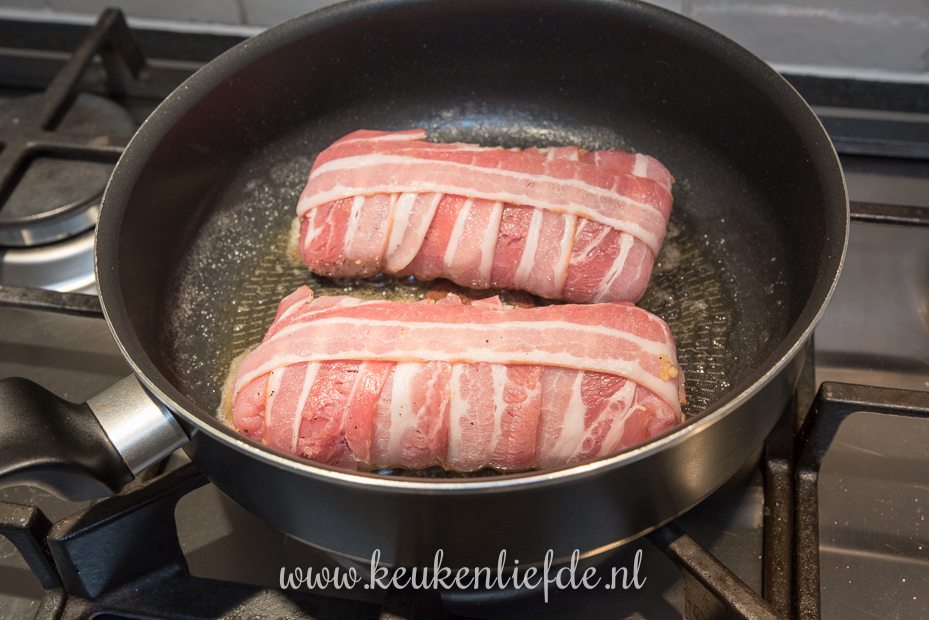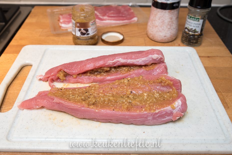 Snijd de varkenshaasjes over de lengte open, maar niet helemaal doormidden. Vul de varkenshaasjes royaal met truffelpesto en klap weer dicht. Bestrooi de varkenshaasjes rondom met zout en peper, niet teveel. Klap het dunne gedeelte van de varkenshaas om, zodat de varkenshaas overal even dik is. Omwikkel met ontbijtspek.
