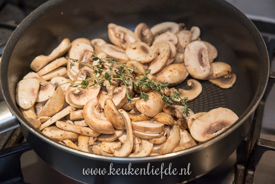 Verwijder met een stukje keukenrol eventueel zwarte stukjes uit het braadvet in de koekenpan. Voeg indien nodig nog wat extra vloeibare boter toe aan het bakvet en voeg de champignons toe. Bak op hoog vuur, totdat het meeste vocht uit de champignons verdampt is en ze beginnen te kleuren. Voeg de sjalot en knoflook toe en bak kort mee totdat de sjalot zacht, maar niet gekleurd is.