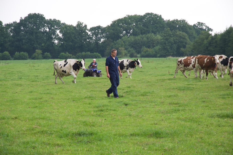 Als er even later grote regendruppels naar beneden vallen, besluiten de koeien richting de stal te gaan. Naast het eigen gras, hooi en mais krijgen de koeien speciaal biologisch geteeld voer te eten.
