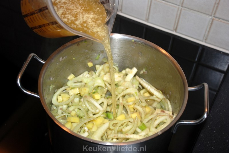 Voeg dan de venkel en aardappel toe en bak even mee. Giet de kippenbouillon erbij en breng aan de kook.
