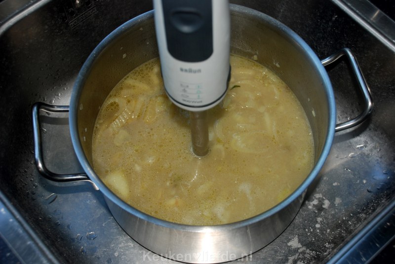 Zet dan het vuur wat lager en kook verder tot de venkel en aardappel gaar zijn, je moet er makkelijk met je vork doorheen kunnen prikken. Zet het vuur uit en pureer de soep glad met de staafmixer.