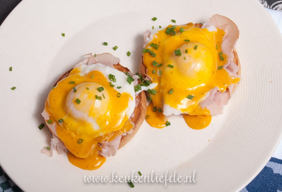 Mijn meest favoriete ontbijt- of lunchgerecht met ei zijn de Amerikaanse eggs benedict: een opengesneden geroosterd muffinbroodje belegd met ham of bacon, twee gepocheerde eieren en rijkelijk overgoten met hollandaise-saus. VerrukGeluk ten top!