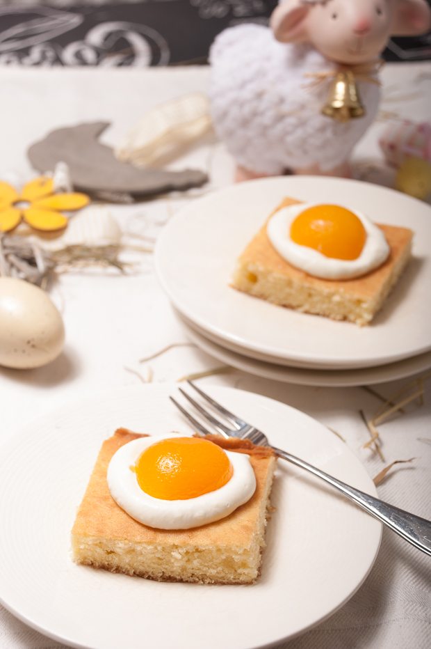 Voor deze feestelijke paascake steek ik een beproefd en geliefd recept in een nieuw jasje. In plaats van de abrikozen in de cake mee te bakken, gebruik ik ze als garnering. Door de abrikozen omgekeerd bovenop een toef slagroom te leggen, lijken ze sprekend op een spiegelei.