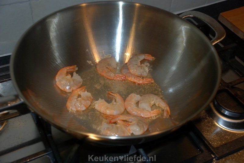 Maak de cocktailsaus. Verhit een wok of koekenpan met wat olie en wok de gamba’s kort tot ze roze kleuren.