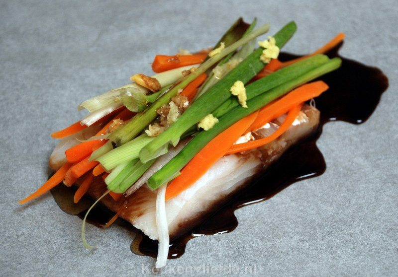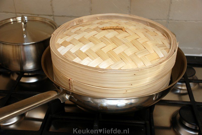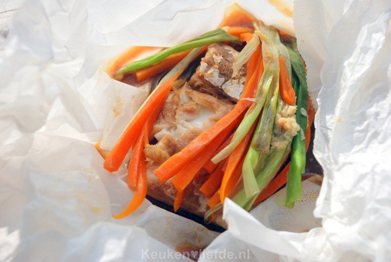 Stoompan en bakpapier of bakblik en aluminiumfolie (bakpapier kan scheuren, waardoor alle sappen uit het pakketje verloren gaan)