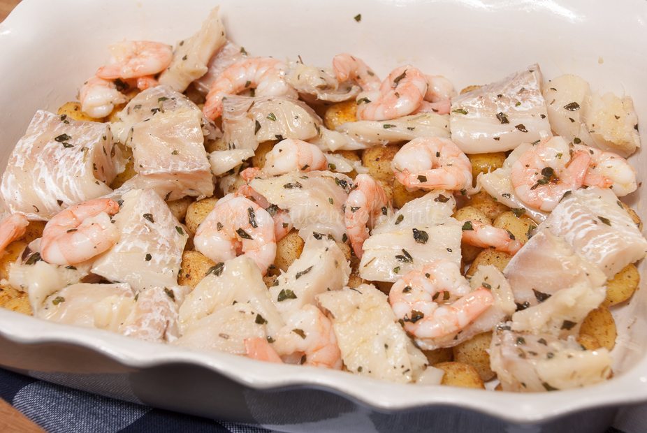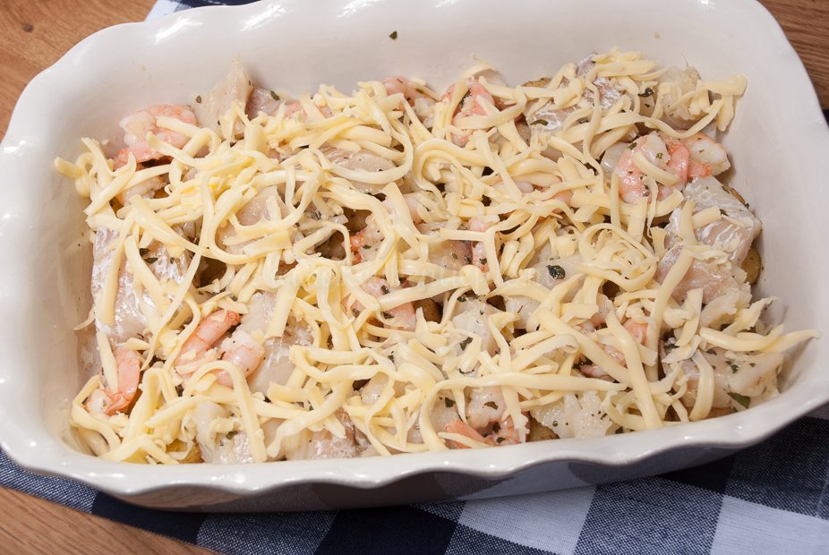 Schep de krieltjes in de ovenschaal. Verdeel de gemarineerde vis eroverheen. Bestrooi met wat zout. Verdeel de geraspte kaas erover.