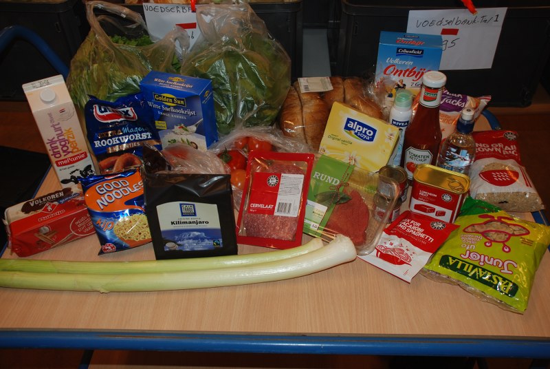 Onderstaand de inhoud van een voedselpakket voor een gezin met 4 kinderen.