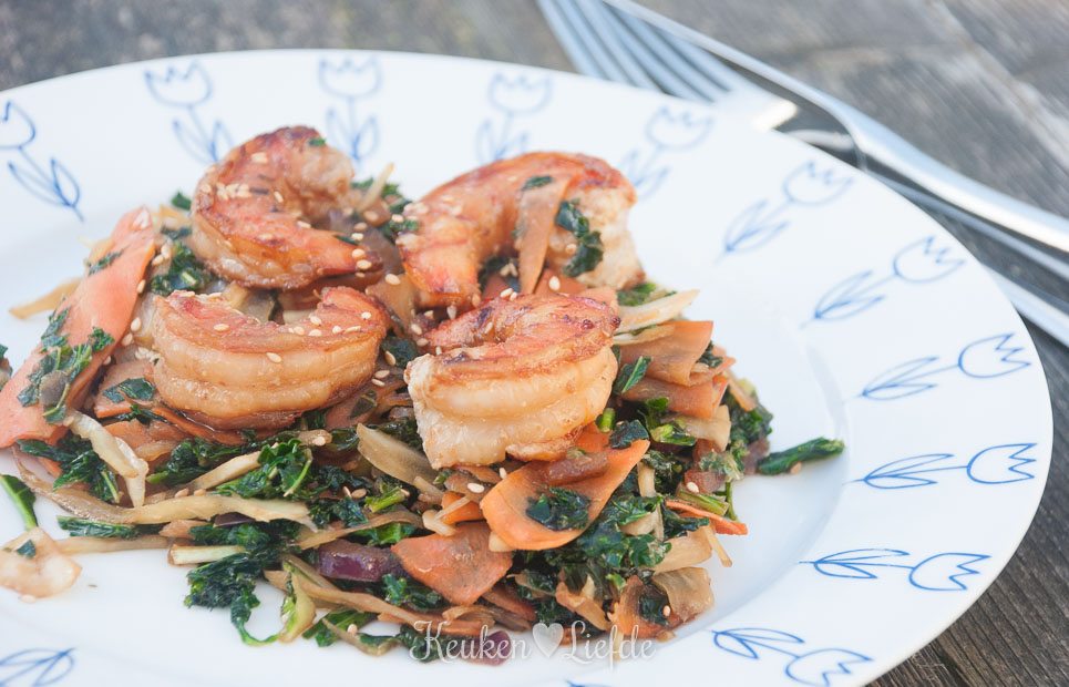 Boerenkoolroerbak met garnalen