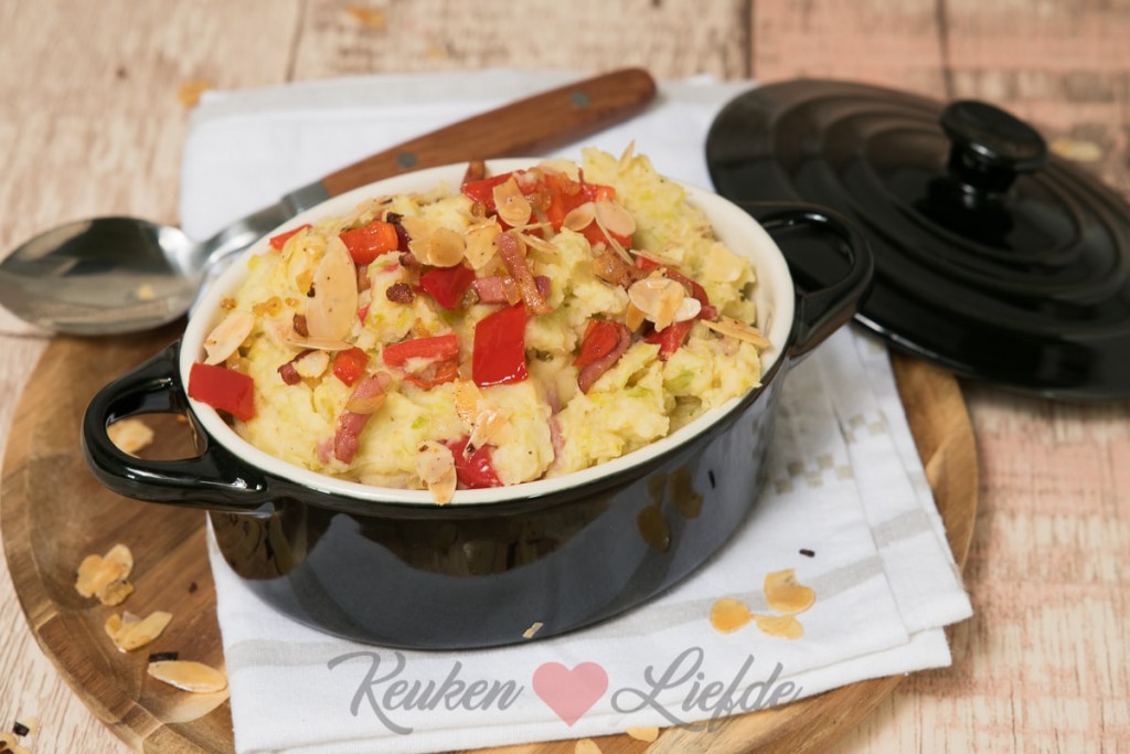 Spruitjesstamppot met spekjes en zoete puntpaprika