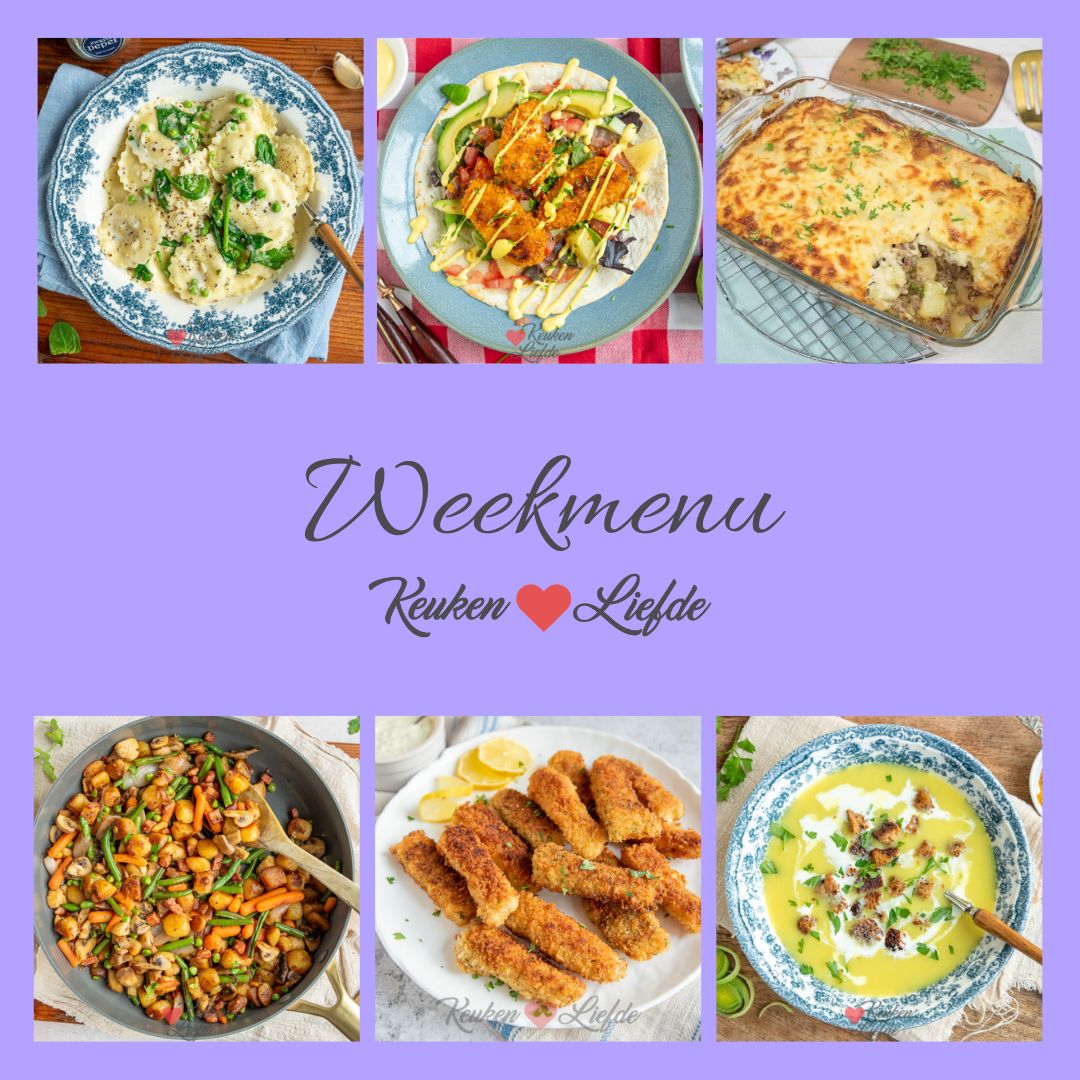 Een weekmenu is een handige en leuke manier om alvast te bedenken wat je de hele week gaat eten. Omdat er bij de meeste mensen vaak één dag in de week is waarop je niet kookt — omdat er bijvoorbeeld kliekjes zijn, of omdat je zin hebt in een frietje of iets anders — deel ik in dit weekmenu 6 hoofdgerechten. Op zondag is het bakdag en deel ik een lekker toetje of baksel met je.