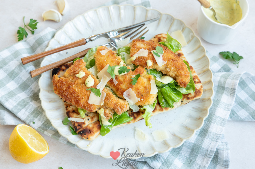 Flatbread met krokante kip en Caesarsalade