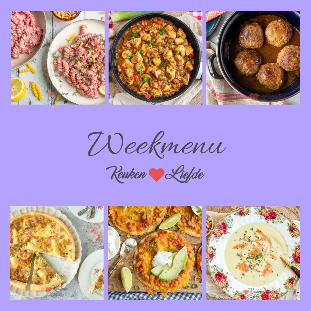 Een weekmenu is een handige en leuke manier om alvast te bedenken wat je de hele week gaat eten. Omdat er bij de meeste mensen vaak één dag in de week is waarop je niet kookt — omdat er bijvoorbeeld kliekjes zijn, of omdat je zin hebt in een frietje of iets anders — deel ik in dit weekmenu 6 hoofdgerechten. Op zondag gaan we op de zoete toer en deel ik een lekker toetje of zoet baksel met je.
