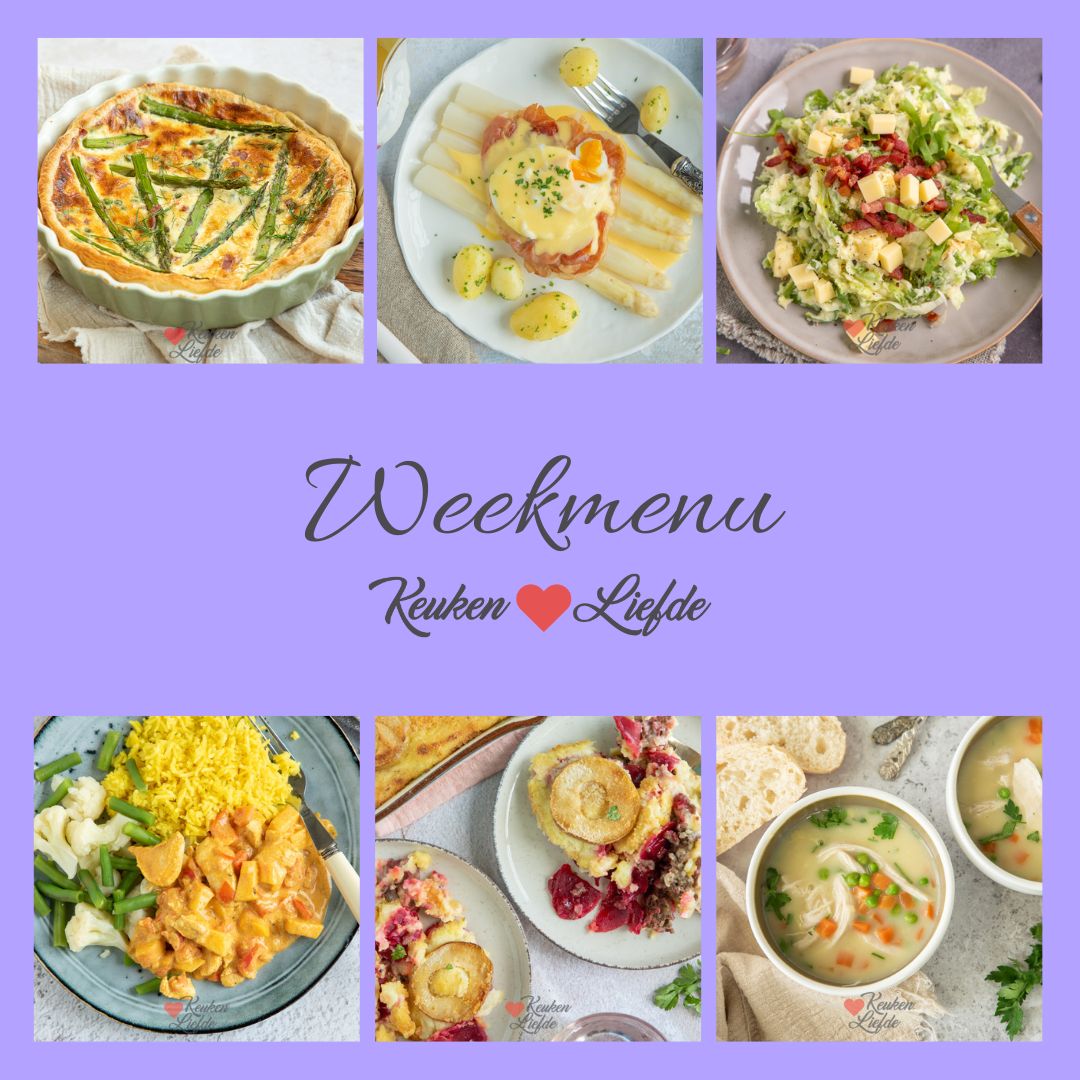 Een weekmenu is een handige en leuke manier om alvast te bedenken wat je de hele week gaat eten. Omdat er bij de meeste mensen vaak één dag in de week is waarop je niet kookt — omdat er bijvoorbeeld kliekjes zijn, of omdat je zin hebt in een frietje of iets anders — deel ik in dit weekmenu 6 hoofdgerechten. Op zondag gaan we op de zoete toer en deel ik een lekker toetje of zoet baksel met je.