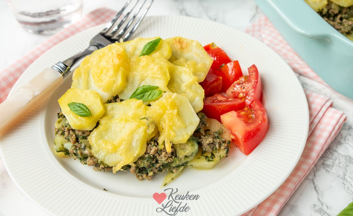 Een smakelijke ovenschotel met aardappelschijfjes, gehakt, courgette, spinazie en pesto. Lekker om te serveren met een frisse tomatensalade.