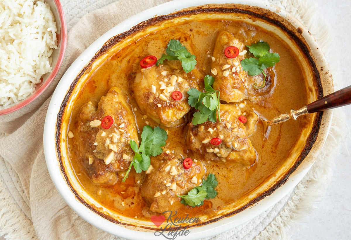 Voor deze kipsaté uit de oven heb je geen satéstokjes nodig. De kippendijen worden gemarineerd en zachtjes gegaard in satésaus in de oven. Makkelijker wordt het niet. Ik vind dit stiekem nog lekkerder dan kipsaté van een stokje.