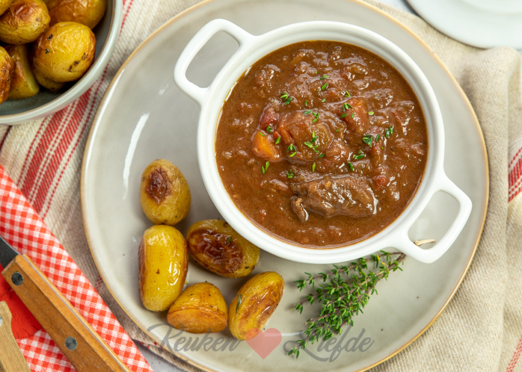Mijn ideale weekendgerecht is een grote pan met stoofvlees. Het is heel makkelijk om te maken, maar moet wel een tijdje opstaan. Ik maak het graag in de slowcooker omdat ik er dan geen omkijken naar heb, maar je kunt het ook in de braadpan maken. Deze variant met pompoen, wortel en rodewijnsaus is heerlijk! Lekker om te serveren met geroosterde aardappels uit de oven.