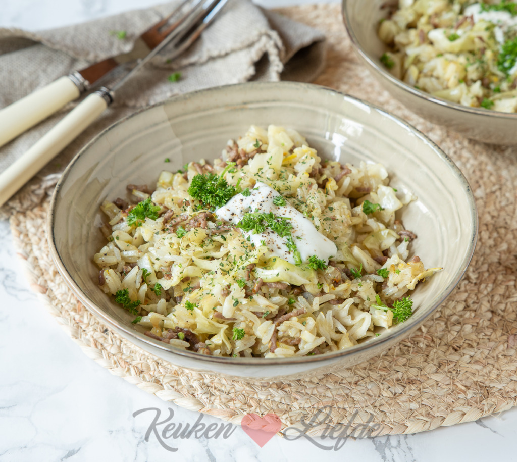 Een makkelijke maaltijd met gebakken rijst, gehakt en verse spitskool Serveer met een lepel Griekse yoghurt of zure room.