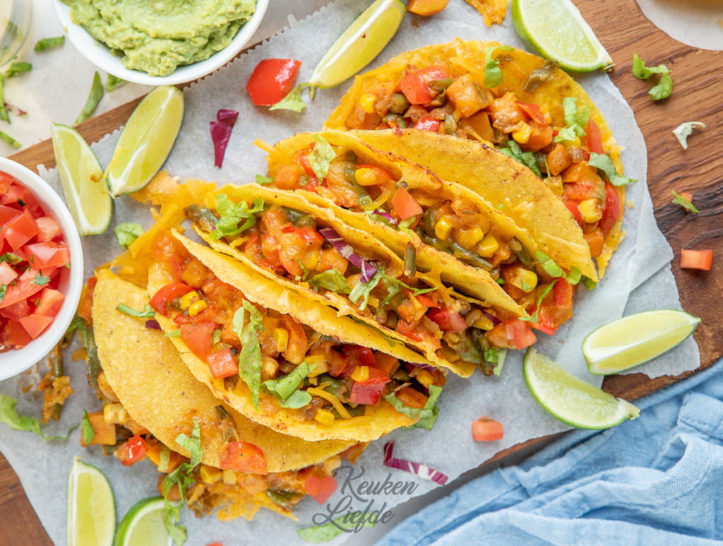 Mexicaanse taco’s met lekker veel verse groente als zoete aardappel, sperziebonen, paprika en mais.
