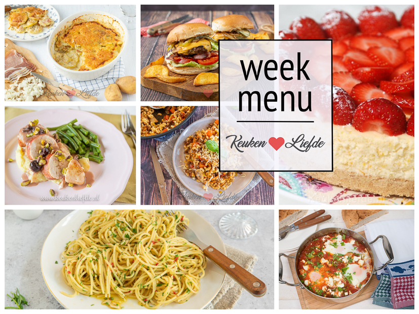 In dit nieuwe weekmenu vind je: spaghetti aglio e olie, aardappel anders ovenschotel, macaroni, gevulde kip met brie en kersensaus en een tomatenpannetje met ei, courgette en feta. In het weekend geniet je van een lekkere cheeseburger en een heerlijke aardbeien cheesecake! Ik wens je een smakelijke week toe!