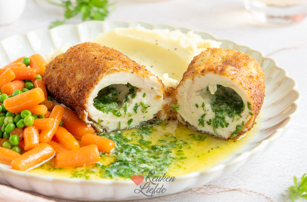 Malse kipfilet gevuld met kruidenboter omhuld door een krokant broodkruimjasje. Heerlijk met romige aardappelpuree en gekookte worteltjes en doperwtjes.