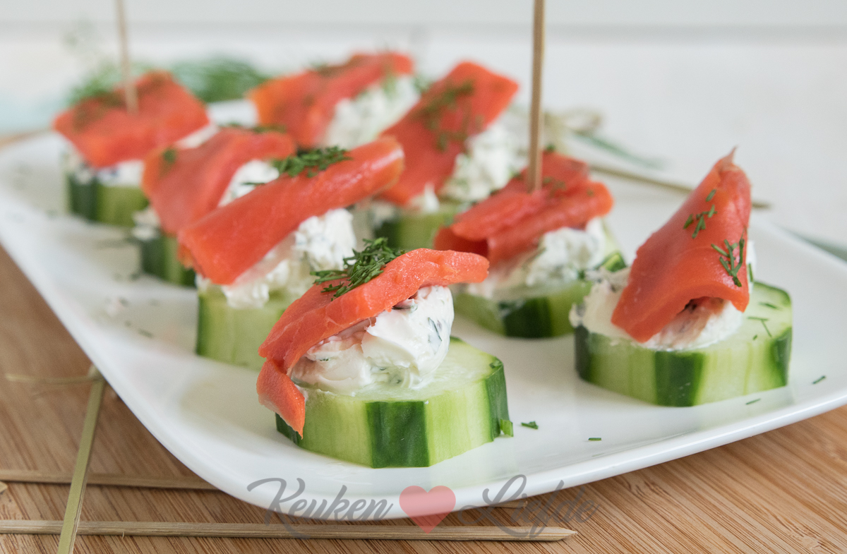 Lekker hapje bij de borrel serveren? Wat denk je van dit komkommerhapje met zalm en roomkaas. Maak er genoeg want ze zijn op voordat je het weet!