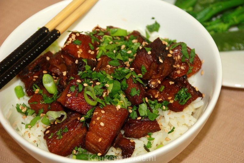 Een langzaam gegaard stuk buikspek is niet alleen waanzinnig lekker, maar ook relatief goedkoop in de aanschaf. In dit gerecht wordt het buikspek eerst langzaam gegaard in een geurige sojamarinade en vervolgens op hoog vuur in de koekenpan gebakken, zodat de saus karameliseerd. Het garen van de buikspek in de marinade kun je al een dag van tevoren doen, zodat je op de dag zelf alleen het vlees nog hoeft op te bakken en wat rijst hoeft te koken. Aan tafel!
