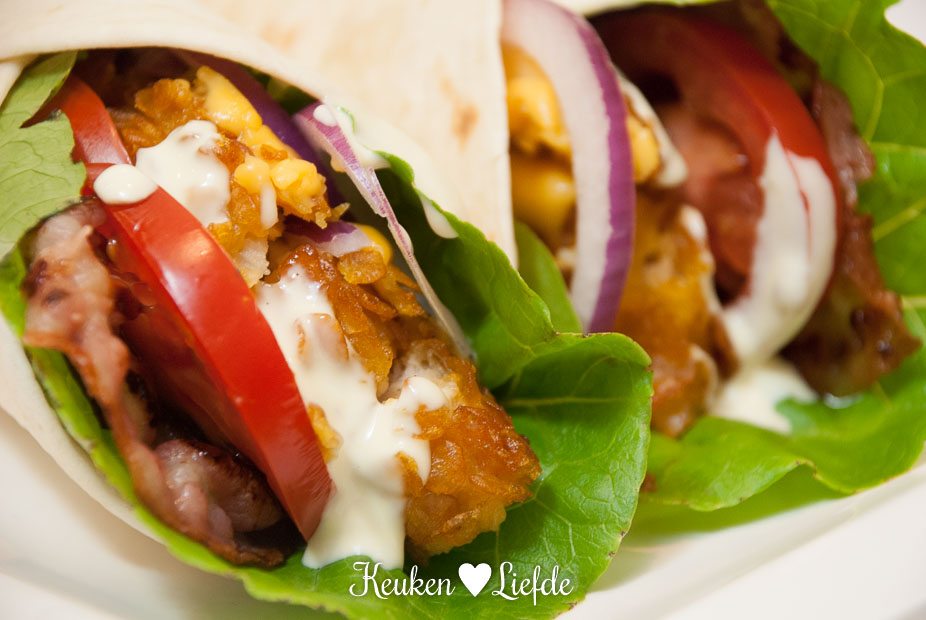 Met deze makkelijke maaltijd maak je het hele gezin blij: een vrolijk opgerolde tortillawrap belegd met krokante kipschnitzel, knapperig ontbijtspek, sla, tomaat en een smakelijk honing-mosterdsausje. Smullen!