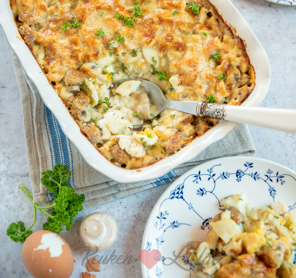 Een hartverwarmende rijstschotel gevuld met malse kip, hargekookt ei en champignonroomsaus. Een echt verwengerecht voor het hele gezin! Je kunt deze schotel grotendeels voorbereiden. De volgende dag hoef je dan alleen de champignonsaus te maken en de ovenschaal te vullen.