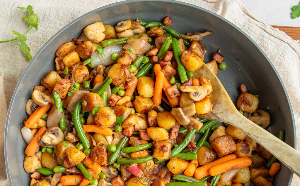 Een klassieke bonne femme schotel met krieltjes, verse groenten en spekjes — heerlijk zo, of met kip/vis/vlees erbij.