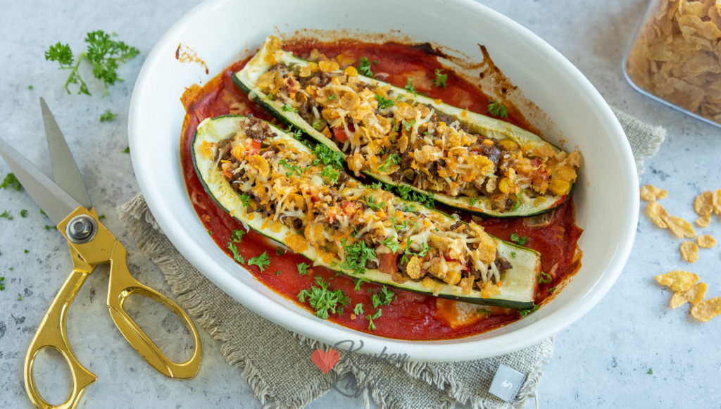 Gevulde courgette uit de oven met Mexicaans gehakt en een krokante topping van cornflakes en kaas. Onderstaande hoeveelheden zijn voor 1 persoon, maar je kunt dit recept ook makkelijk voor meerdere mensen maken. Dit is een koolhydraatarm recept, maar als je wilt kun je er gekookte rijst, aardappelpuree, of gebakken aardappels bij serveren. Het recept is dan voldoende voor 2 personen als hoofdgerecht.