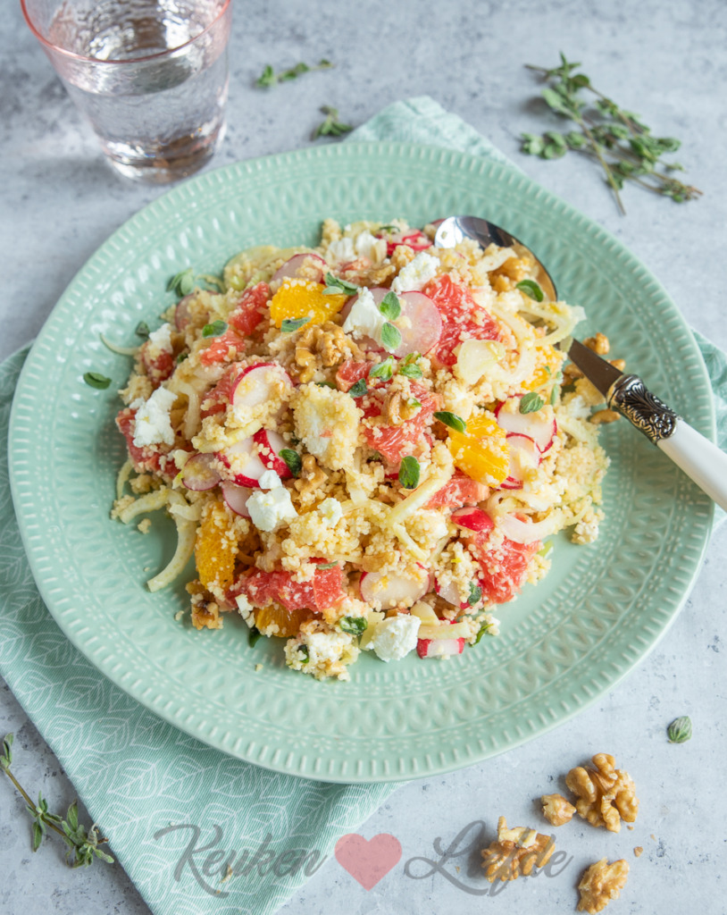 Iets heel lekkers koken zonder veel moeite? Deze couscous is gevuld met frisse grapefruit en sinaasappel, venkel, walnoten en romige feta. Verrassend lekker en snel op tafel! Serveer als vegetarisch gerecht maar ook lekker met gebakken kip of zalm.