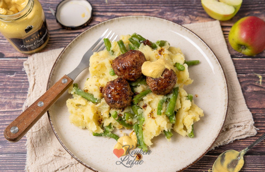 Hete bliksem met sperziebonen en gehaktballetjes