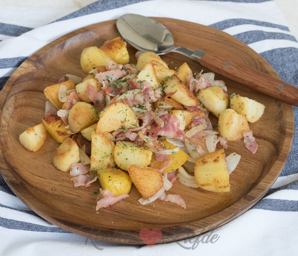 Gebakken aardappels met spek en ui. Lekker met gebakken kip, een tartaartje of een vegetarische burger.