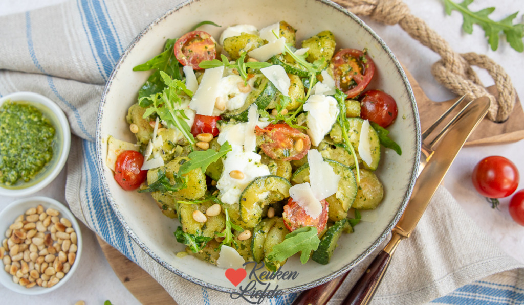 Knapperige gebakken gnocchi met huisgemaakte pesto, frisse courgette, zoete cherrytomaatjes en smeltende mozzarella. Een simpel en vegetarisch gerecht dat je in een handomdraai op tafel zet!