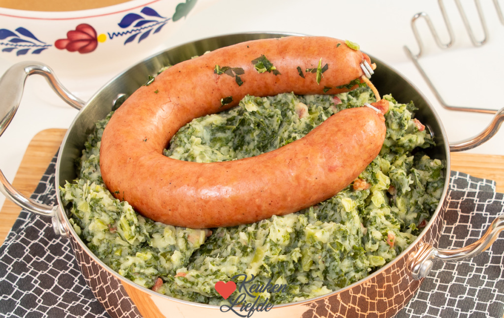 Hartverwarmende herfstkost voor een kille, grijze dag. Deze boerenkoolstamppot wordt geserveerd met sappige rookworst en zelfgemaakte jus.