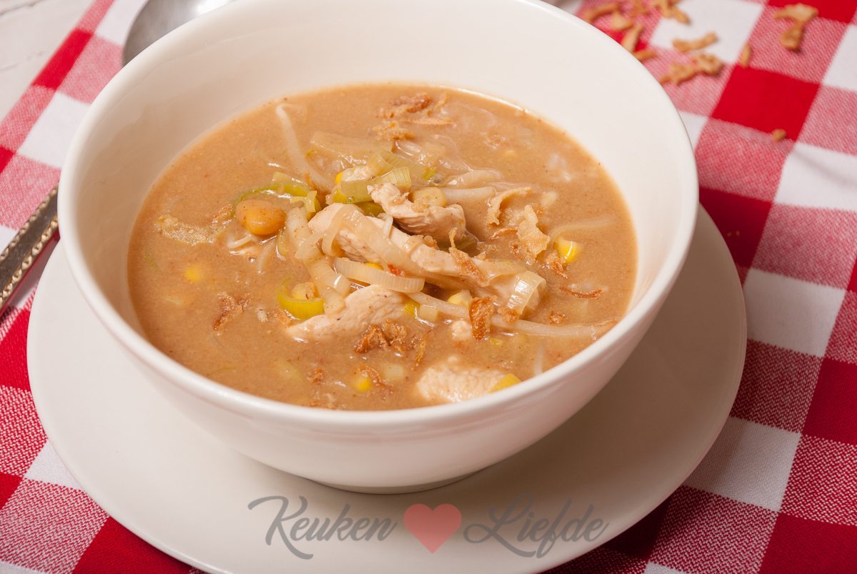 Tijd voor een lekker soepje! Deze eigen versie van Surinaamse pindasoep is goed gevuld met malse kipfilet, mais, prei en taugé en staat snel op tafel!