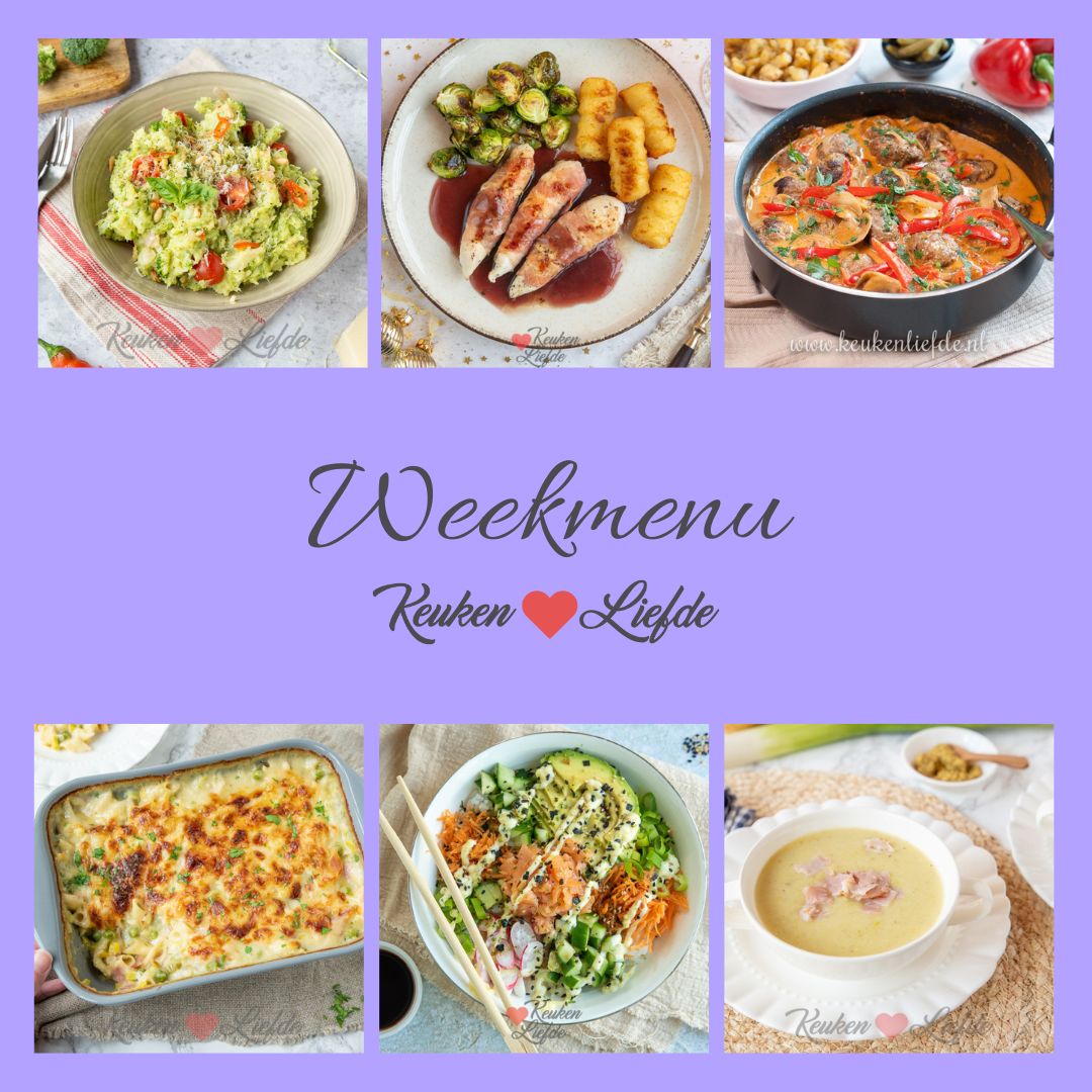 Een weekmenu is een lijst van maaltijden die voor een hele week zijn gepland. Omdat er bij de meeste mensen vaak één dag in de week is waarop je niet kookt — omdat er bijvoorbeeld kliekjes zijn, of omdat je zin hebt in een frietje of iets anders — deel ik in dit weekmenu 6 hoofdgerechten. Op zondag deel ik een lekker toetje of baksel met je.