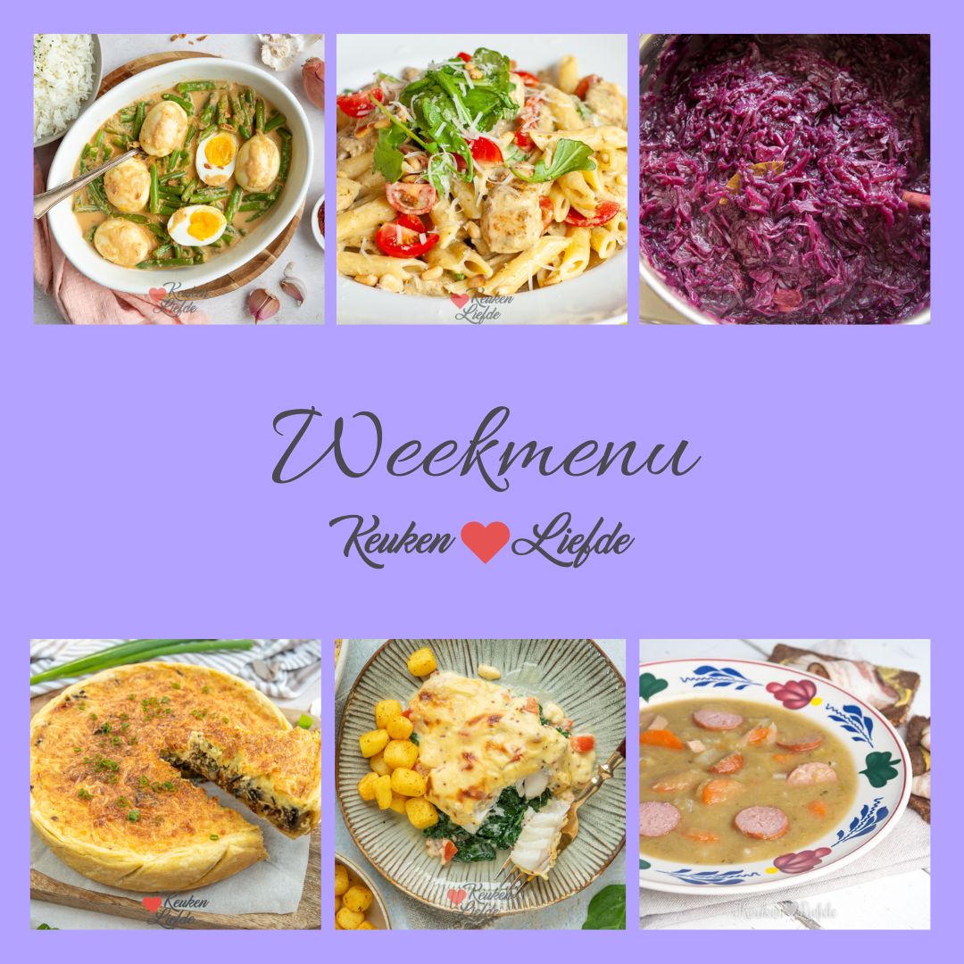 Een weekmenu is een lijst van maaltijden die voor een hele week zijn gepland. Omdat er bij de meeste mensen vaak één dag in de week is waarop je niet kookt — omdat er bijvoorbeeld kliekjes zijn, of omdat je zin hebt in een frietje of iets anders — deel ik in dit weekmenu 6 hoofdgerechten. Op zondag deel ik een lekker toetje of baksel met je.