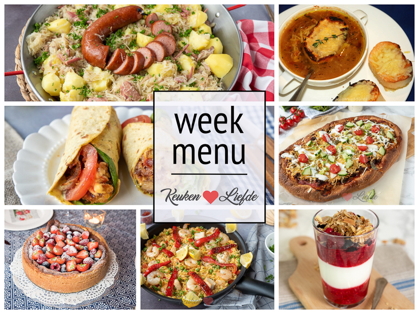 In dit weekmenu: paella met kip en garnalen, blt-wraps met krokante kip, ontbijt trifle met granola, Franse uiensoep en een Turks brood pizza met gehakt en knoflooksaus . In het weekend kun je genieten van Elzasser zuurkool en gebakken kwarktaart met rood fruit. Elke dag wat anders, zo blijft het leuk en lekker!