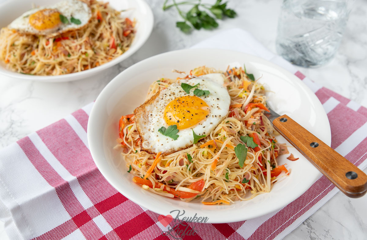 Een grote pan mihoen goreng met lekker veel verse groenten, daar maak je iedereen blij mee. Hij staat bovendien snel op tafel.