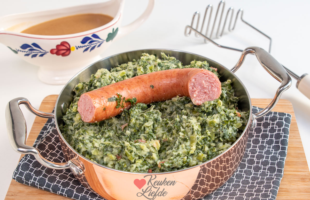 Ouderwets stampen met deze heerlijke boerenkool stamppot. Ik serveer en een lekkere rookworst bij met jus. Daar maak je iedereen blij mee.