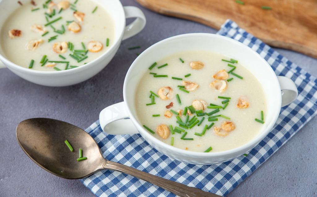 Makkelijke bloemkoolsoep met geroosterde hazelnoten en bieslook. Licht, snel en vol smaak.