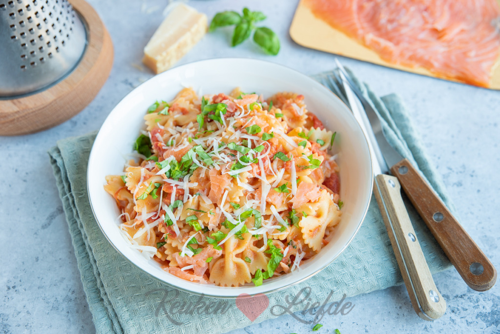 Farfalle met romige tomatensaus en zalm: een snel pastagerecht dat toch voelt als iets speciaals. De saus staat zo op tafel en je kunt elke pasta gebruiken die je in huis hebt.