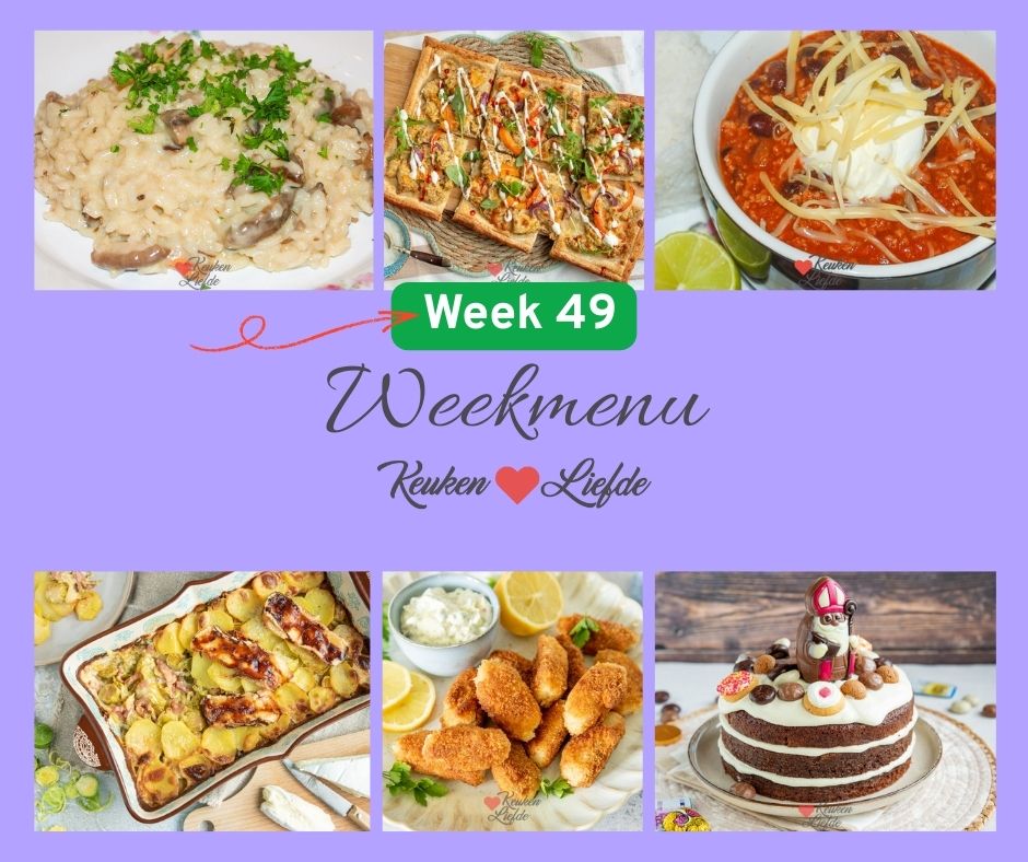 Omdat er bij de meeste mensen vaak één dag in de week is waarop er niet gekookt wordt — omdat er bijvoorbeeld kliekjes zijn, of omdat je zin hebt in een frietje of iets anders — deel ik in dit weekmenu 6 makkelijke maaltijden. Op zondag bakken we een heerlijke Sinterklaas taart!