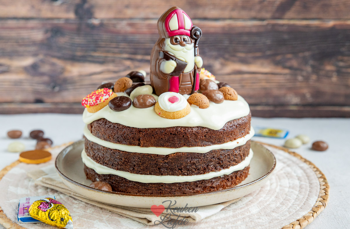 Een feestelijke laagjestaart van chocolade- en speculaastaart en roomkaasglazuur afgewerkt met sinterklaaslekkernijen. De perfecte taart voor het heerlijk avondje!