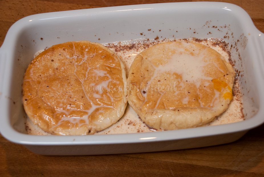 Snijd de beschuitbollen doormidden. Besmeer het brood met chocopasta en beleg met plakjes banaan. Verhit de koekenpan met boter. Klop het ei los met de melk, kaneelpoeder en suiker en wentel de beschuitbollen hier doorheen. Bak de beschuitbollen aan beide kanten goudbruin in de boter.