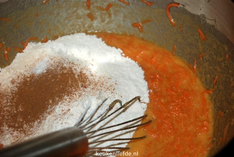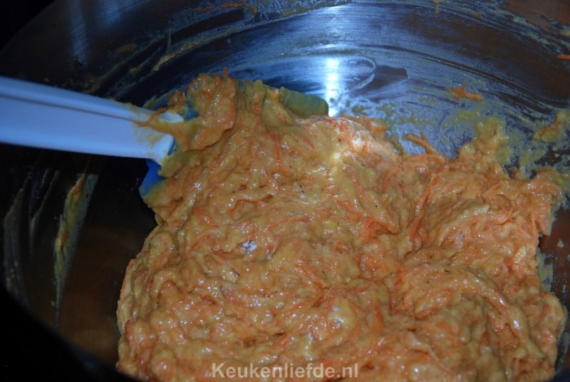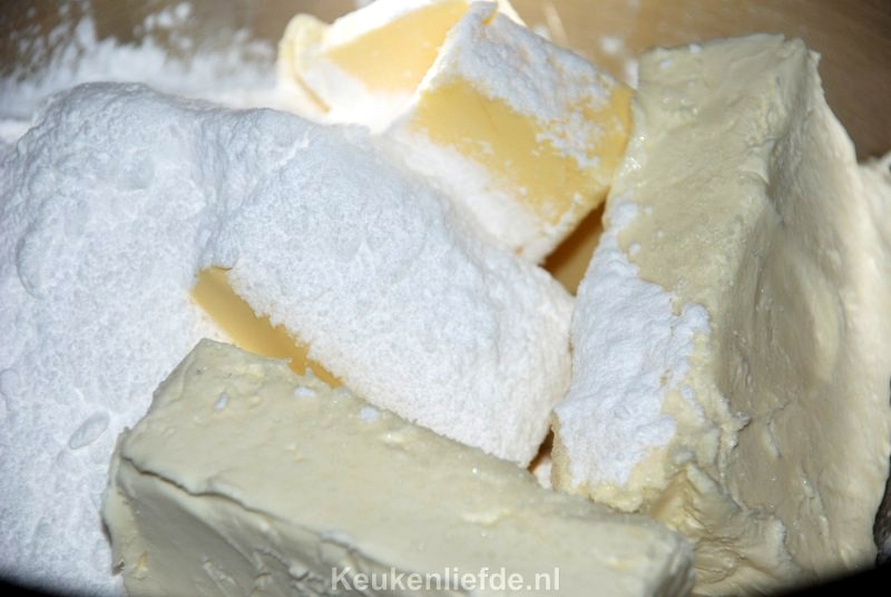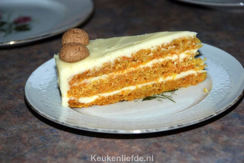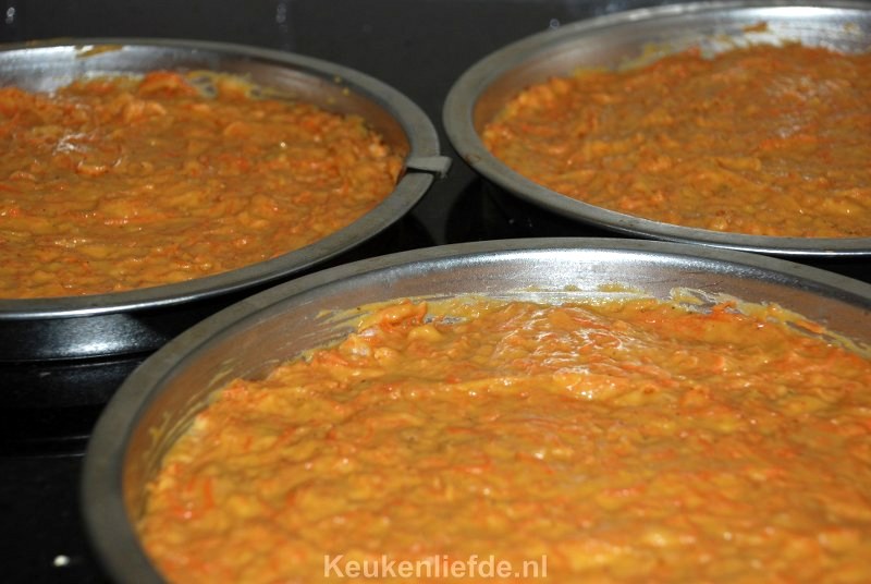 Ik vond het lastig om de buitenkant van de worteltaart mooi glad en egaal te krijgen, omdat de roomkaas zacht is en je het steeds weer wegsmeert. ‘Plamuur’ daarom eerst de buitenkant met weinig roomkaas en houdt wat achter voor later. Zet de taart in de koelkast zodat de roomkaas iets harder wordt. Je kunt de taart dan makkelijker gladstrijken en afwerken met het overige roomkaasmengsel.