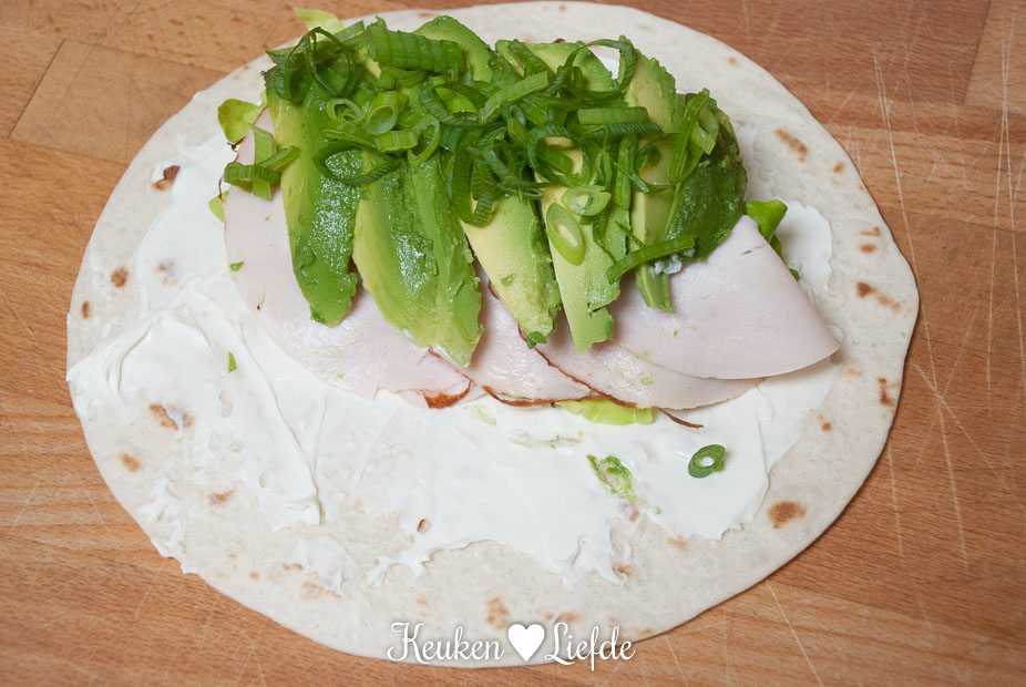 Besmeer de wrap royaal met roomkaas en beleg met sla, kip, avocado en lente-ui.