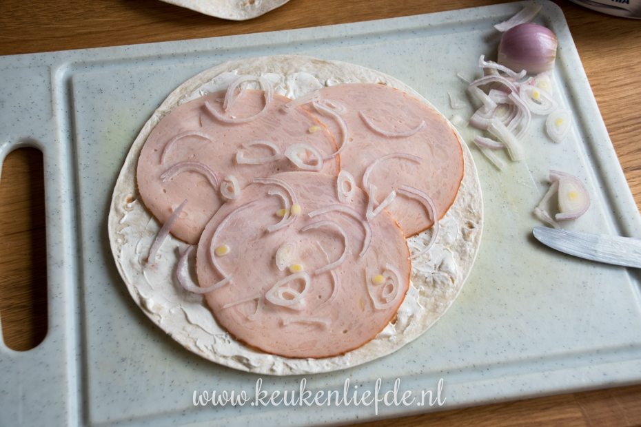 Ipv sjalotje rode paprika heel fijn snijden en paprikapoeder door de roomkaas, en uitje door de roomkaas en zou en peper op wrap dan rookvlees en ijsbergsla